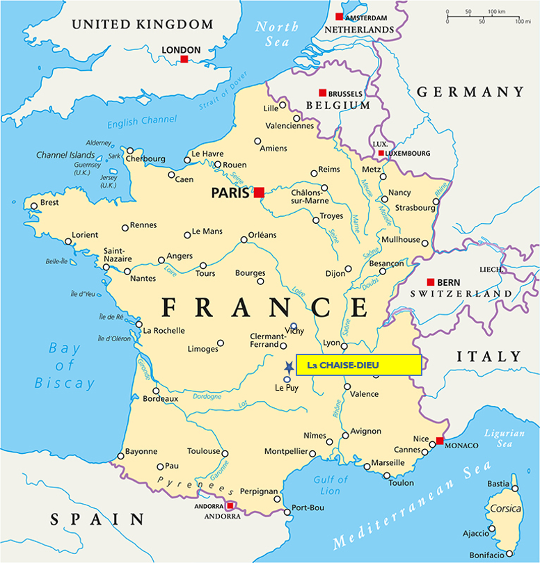 It’s not easy to get there, though. This is one of France’s wildest, least-populated regions. La Chaise Dieu itself is 3,500 feet above sea level, deep in the vast Livradois forest in southwestern France, with only two hotels and a handful of restaurants (including the classic French “bar snacks” and pizza places). For most of the year, only 725 people live in town.