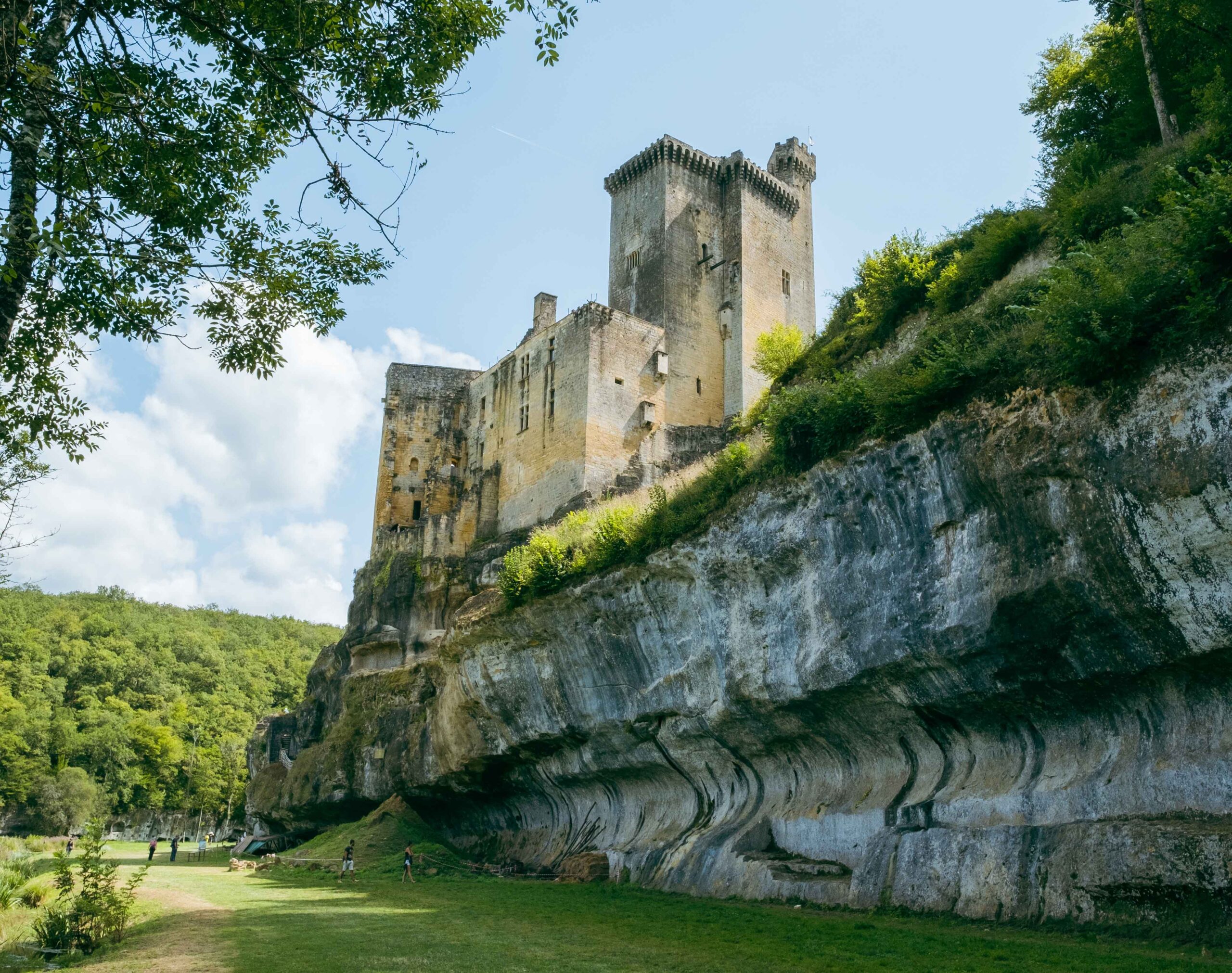 At its base (and in the rock wall facing the castle across the meadow) you can see several cave openings, hinting at epochs long before the medieval construction. And the meadow in between is lush, bucolic, populated with cattle and hikers making their way around the site. Another castle – the 13th-century Château de Laussel – is visible on a nearby hill (although signs at the ticket booth here make it clear that “you can’t visit it – it has hotel rooms available for week-long stays, but the path from here to there is private”).